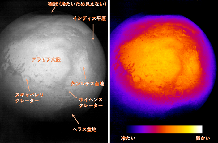 TIRIが約4万kmの距離から 撮像した赤い惑星の火星。アラビア大陸地域が確認されます。またTIRIの検出限界以下の低温の極冠や、太陽系最大規模の衝突クレータであるヘラス盆地も低温領域として確認できます。